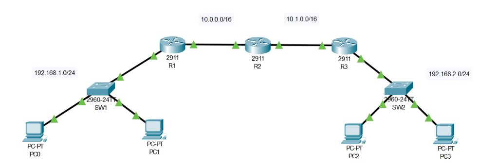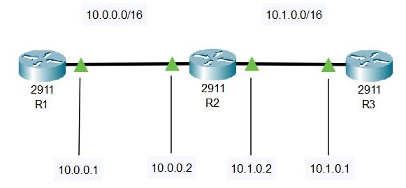You may be asking yourself… cant we connect both networks with just 1 router!? Sure! But that wouldn’t make this lab very fun (we wouldn’t have to configure any static routes; more on that later)? Our first step should be narrowing our focus, we can start by isolating the diagram to just 3 routers.