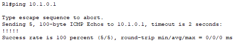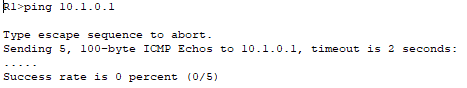 Now that we’ve diagnosed our issue, lets add a route so we can start talking with R3. In cisco we accomplish this by using the “ip route <ip> <subnet mask> <int>” command. This command requires that we specify what network we’re trying to reach and the interface we need to forward traffic out of to accomplish that. With this scenario, were trying to reach R3. So our complete command would be “ip route 10.1.0.0 255.255.0.0 GigabitEthernet 0/0”. Any traffic destined for 10.1.0.0/16 should be forwarded out of interface GigabitEthernet 0/0. Lets test this connection with a ping.