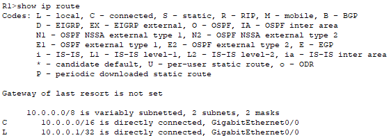Do you see the issue with this? We cant reach 10.1.0.0/16 because R1 has no clue where its at! What about the other two routing entries? We haven’t configured anything yet, so why are they there? The other two routes are known as “local” and “connected” routes. Those were automatically added when the connection was made on interface Gig0/0. The “connected” route is because we have a direct connection with the other router which also has a 10.0.0.0/16 address. The “local” connection is the IP we configured on this interface.