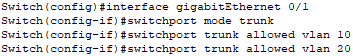 The switch configurations stay pretty consistent. Interfaces linked to computers can stay in “access” mode. However, we’ll switch the mode to “trunk” on the interface linked to our router. With this trunk interface, we can designate which VLANs are permitted to pass through it.